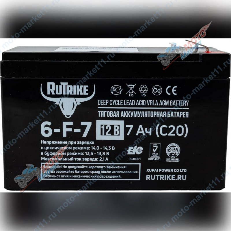 Тяговый аккумулятор Rutrike 6-F-7 (12V7A/H C20)выполнен по технологии AGM и состоит из утолщённых свинцовых пластин и плотного слоя сепаратора между ними. Батареи не требуют обслуживания на протяжении всего цикла эксплуатации. Допускается эксплуатация в любом положении, кроме перевёрнутого.