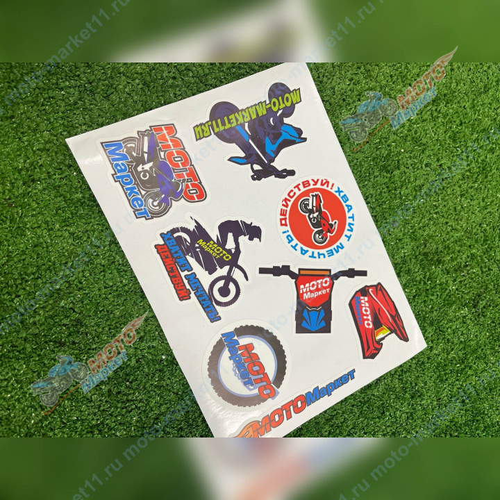 Стикерпак с логотипом нашего магазина «Мотомаркет», и слоганом.