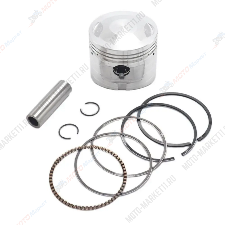 В комплектацию входят сам поршень, кольца, палец диаметром 15 мм и стопорные кольца.
