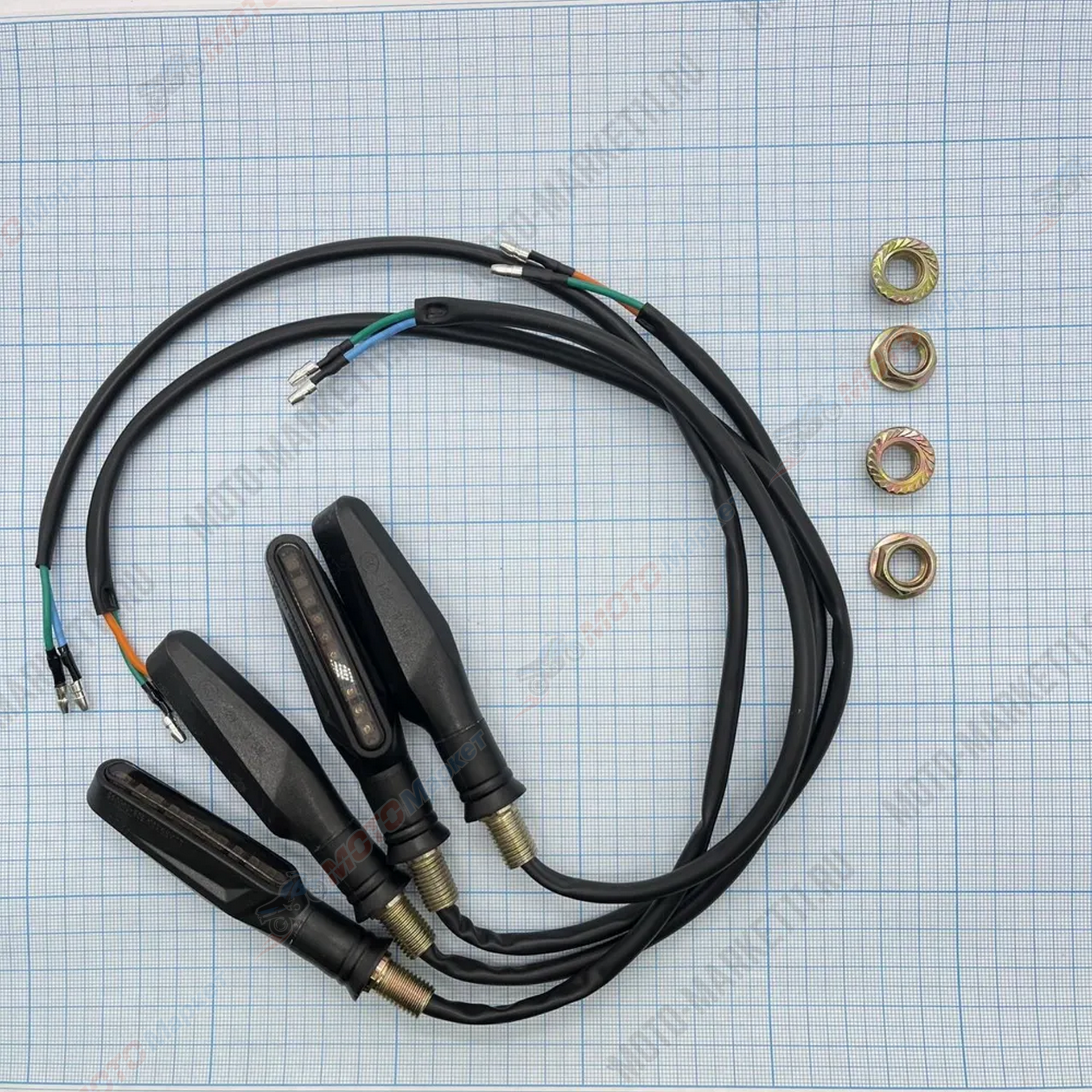 В комплектацию входят 4 указателя поворота и 4 гайки.